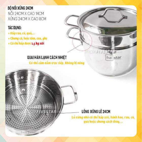 Bộ gồm 1 quánh 18cm, 1 nồi inox 20cm, 1 nồi inox 24cm, 1 chảo xào 24cm và 1 xửng hấp 24cm (để vừa nồi 24cm ráp thành bộ nồi xửng 24cm).