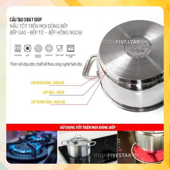 Bộ 5 nồi fivestar đáy từ nắp kính được sản xuất tại Việt Nam, chất liệu inox 430 ngoại nhập, không bị oxy hoá, có thể sử dụng lâu dài và đảm bảo an toàn cho sức khoẻ. Đáy nồi cấu tạo 3 lớp dày dặn giúp nhiệt liệu tỏa đều, thức ăn nấu không bị bén nồi và giữ nhiệt tốt, giúp tiết kiệm được nhiên liệu.