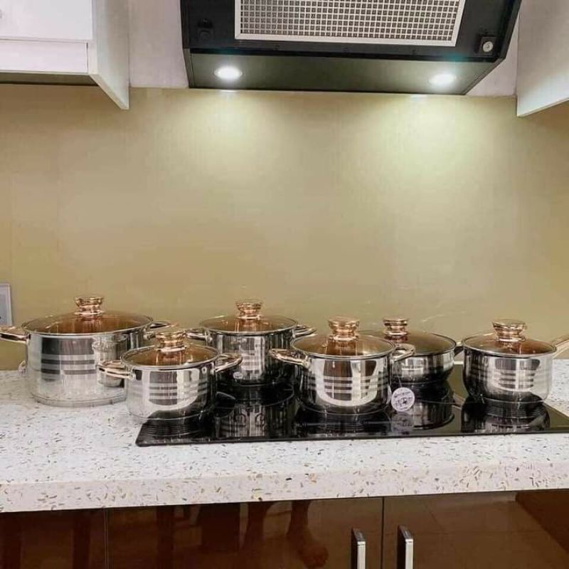 Nồi hàng hãng gồm 12 món- ĐÁY NỒI 5 LỚP chất liệu, tiết kiệm 45% điện năng khi sử dụng với bếp từ, một bộ nồi có đầy đủ cho tất cả.
