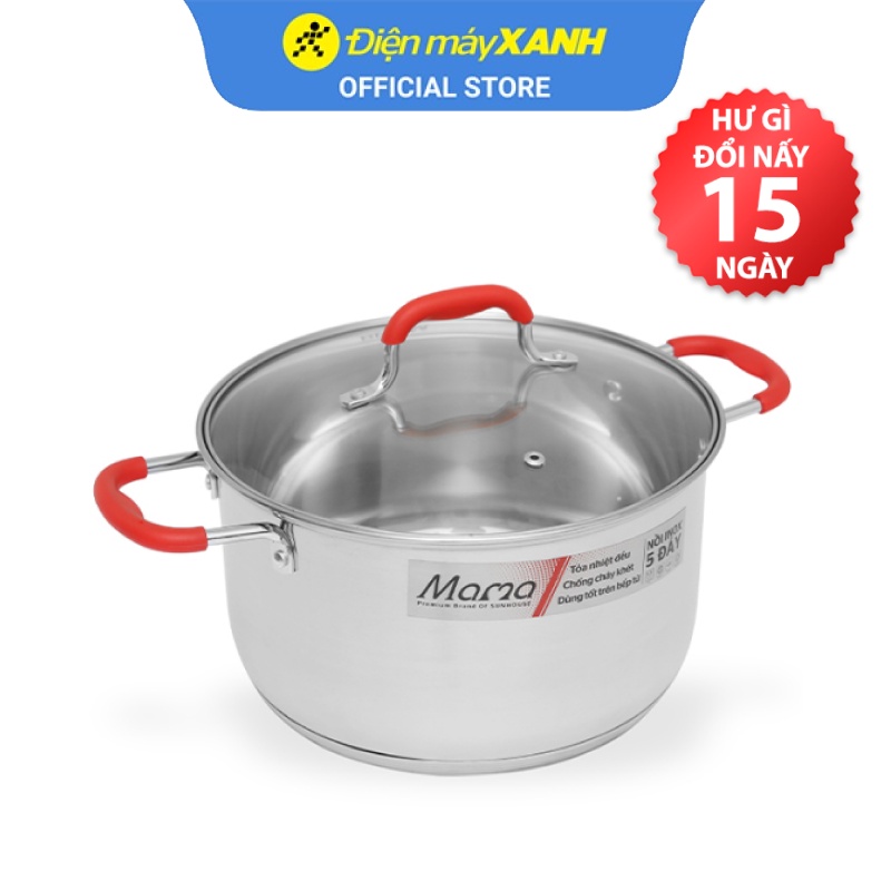 • Nồi inox 5 đáy 24cm Sunhouse Mama thiết kế với kiểu dáng bo tròn mềm mại, nhỏ gọn sang trọng, góp phần làm đẹp thêm không gian bếp nhà bạnNồi với đáy rộng 24 cm, thích hợp nấu canh, luộc gà hoặc lẩu cho 3 - 5 người.