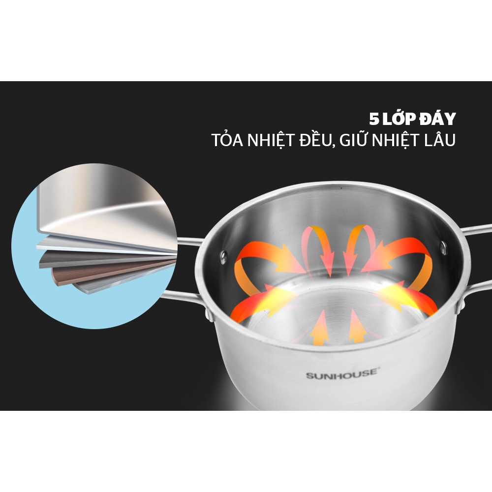 Bộ nồi inox 5 đáy SUNHOUSE MAMA SH784 có cấu tạo 5 lớp đáy dày dặn, giúp nhiệt lượng tỏa đều khắp đáy, thức ăn chín ngon, giảm cháy khét hiệu quả.