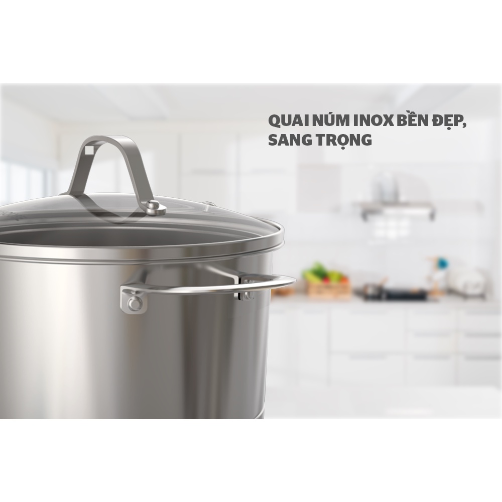 Quai và núm cầm được làm bằng inox, tán đinh chắc chắn, dễ cầm nắm và chịu lực tốt. Bạn sẽ rất dễ nâng nhấc và di chuyển nồi trong quá trình sử dụng. Không chỉ vậy, dáng quai thanh mảnh còn góp phần tạo nên tổng thể hài hòa đẹp mắt của bộ sản phẩm.
