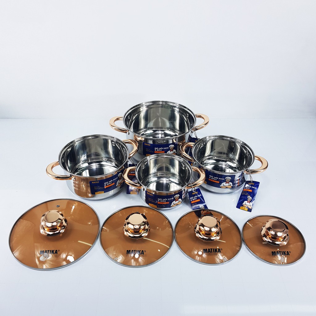 Giới thiệu Bộ Nồi inox 5 Đáy Từ 6 Món EB-8013/MATIKA Inox Không Gỉ Kèm Năp Kính Cao Cấp Dùng Cho Mọi Loại Bếp, có phân loại lẻ size