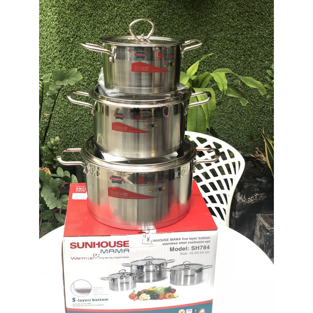 Bộ nồi inox 5 đáy SUNHOUSE MAMA SH784 sử dụng được với mọi loại bếp, kể cả bếp từ. Bộ sản phẩm gồm 3 nồi với đường kính 16cm - 20cm - 24cm phù hợp với nhu cầu nấu nướng của mọi gia đình. Nồi nhỏ 16cm thích hợp để luộc trứng, kho thịt, nồi cỡ trung 20cm để nấu canh cho 2-4 người và nồi lớn 24cm có thể luộc gà, nấu canh hoặc lẩu cho 3-5 người