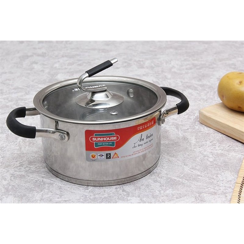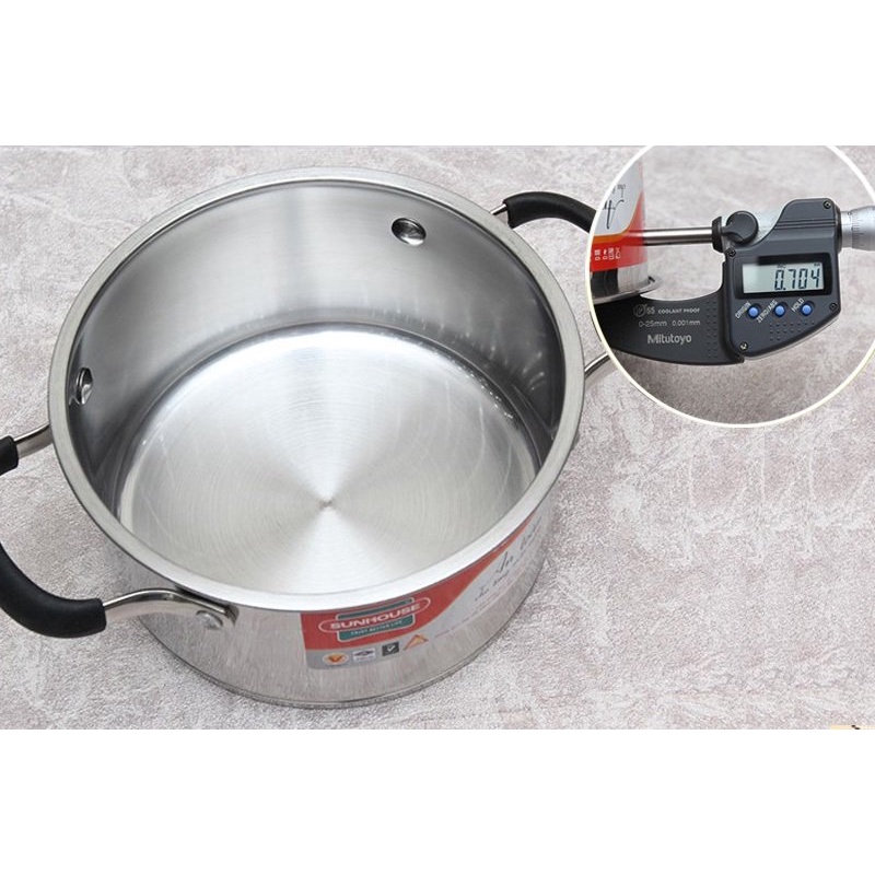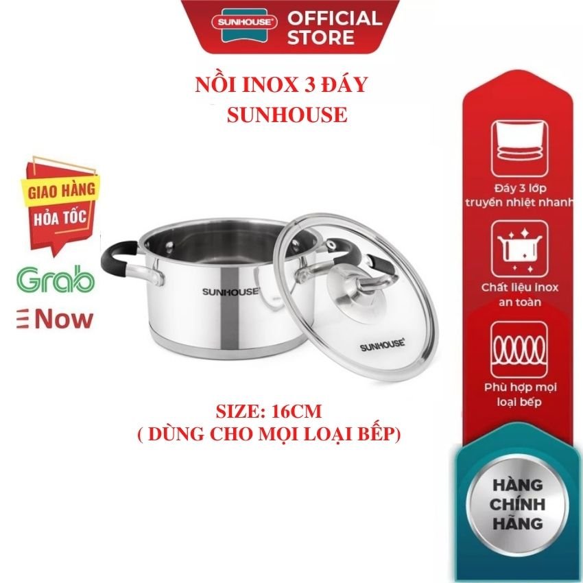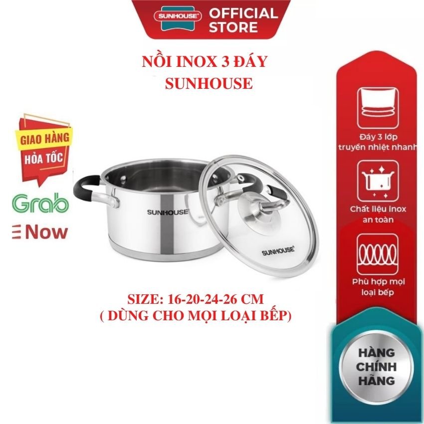 Nhà cửa & Đời sống > Dụng cụ nhà bếp > Nồi || Nồi inox bếp từ 3 đáy nắp kính SUNHOUSE 16 20 24 26 CM Siêu Dày (dùng được mọi loại bếp) Mới 100% Chính Hãng Bảo HànhCòn hàng