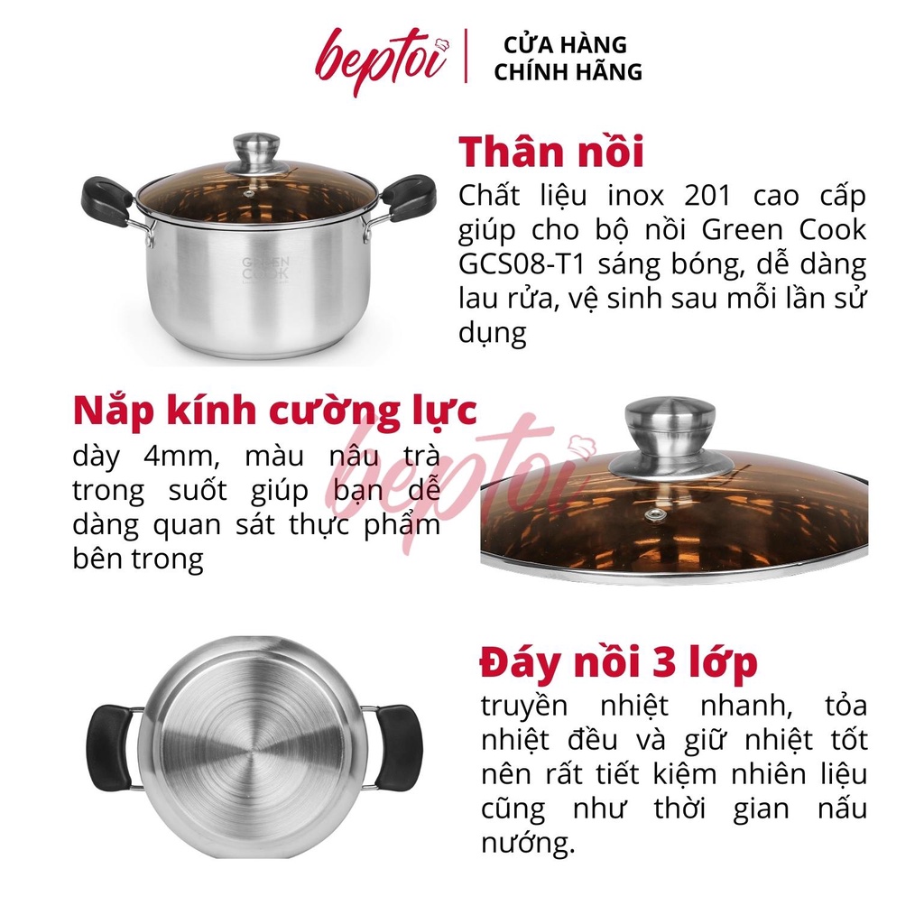 Bộ nồi inox cao cấp 3 đáy, nồi chống dính bếp từ Green Cook GCS08-T1