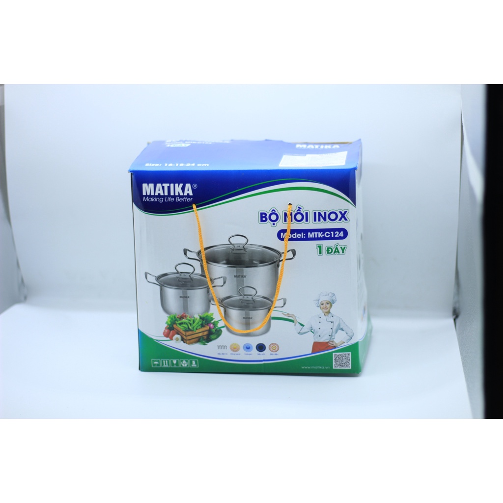 Nồi inox Matika MTK-C124 bộ 3 nồi cao cấp, thiết kế hiện đại đáy từVới thiết kế hiện đại, sang trọng, chất liệu inox cao cấp sử dụng được trên tất cả các loại bếp, nồi inox Matika MTK-C124 có khả năng truyền nhiệt vượt trội giúp bữa cơm gia đình trở nên nhanh chóng và tiện lợi nhất.