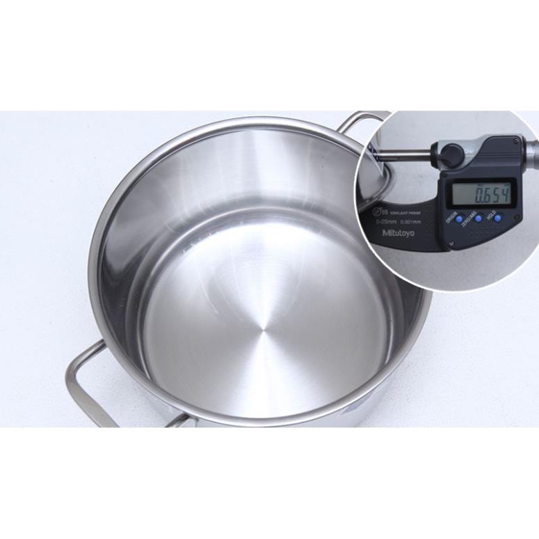 Đáy nồi có cấu tạo 3 lớp: 2 lớp ngoài là inox, lớp giữa là hợp kim nhôm. Cấu tạo này giúp nồi hấp thu nhiệt nhanh, tỏa nhiệt đều.