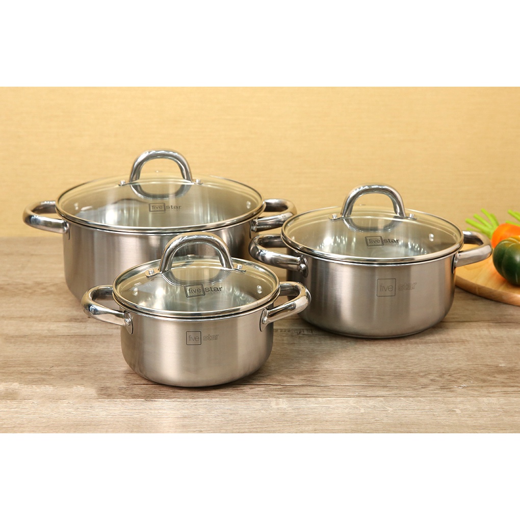 Nhà cửa & Đời sống > Dụng cụ nhà bếp > Nồi || Bộ nồi inox Fivestar 3 món nắp kính 3 đáy sandwich dùng được bếp từ bếp từ , gas, hồng ngoại , tặng 5 muỗngCòn hàng