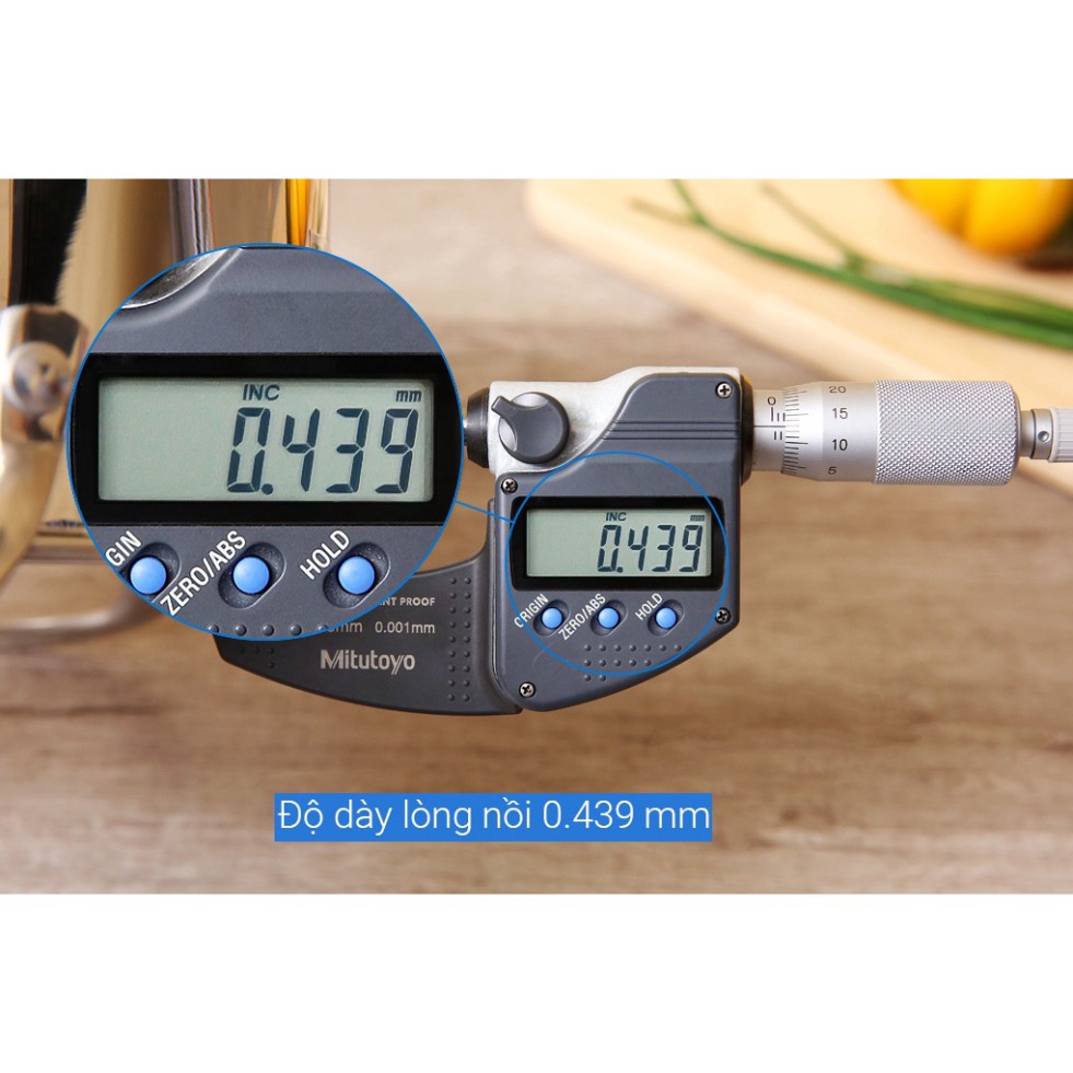 Đáy nồi thiết kế rộng, phẳng, dập 3 lớp (inox 430 – nhôm – inox 430). Đặc tính của inox là ít phản ứng với thức ăn, an toàn sức khỏe, đặc tính của nhôm là hấp thu nhiệt tốt, tỏa nhiệt đều, nấu thức ăn chín nhanh, tiết kiệm năng lượng tối ưu.