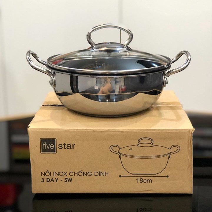 -Nồi kho cá hoặc nồi Inox 3 đáy chống dính 18cm Fivestar đường kính 18cm với mặt đáy phủ lớp chống dính thiết kế có thể chiên không dầu,hoặc chiên ngập dầu tiện cho bạn nấu nướng, đặc biệt kho cá, thịt tiết kiệm dầu ăn tối ưu, tốt hơn cho sức khỏe. với lớp chống dính giúp thức ăn chín đều và dễ dàng đảo, trộn trong quá trình kho nấu mà không làm gãy nát thức ăn, giúp món ăn đặc biệt món cá kho của bạn không chỉ ngon mà còn đẹp mắt