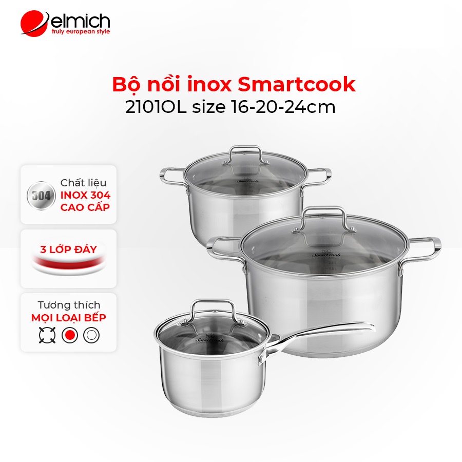 Giới thiệu [Mã LIFEMALL9915 giảm 12% đơn 99K] Bộ nồi inox Smartcook 2101OL size 16-20-24cm