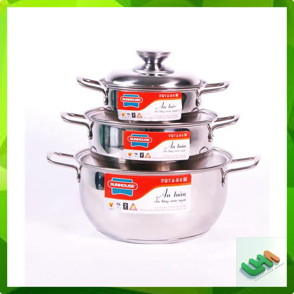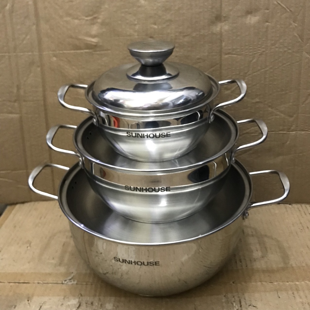 Nhà cửa & Đời sống > Dụng cụ nhà bếp > Nồi || Bộ nồi inox Sunhouse 3 đáy SH335 dùng được bêp từ (hàng chính hãng)Còn hàng