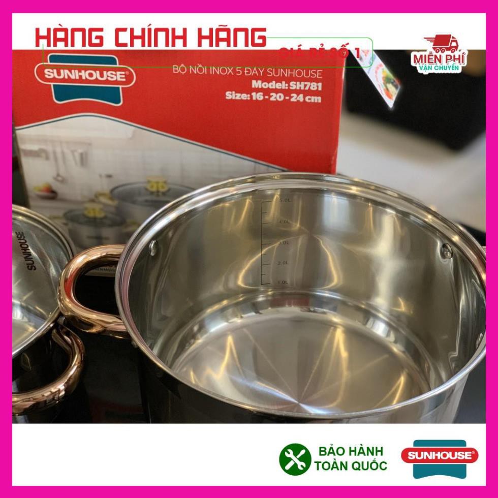 Bộ nồi inox Sunhouse SH781, Bộ nồi Sunhouse SH781,, 5 đáy dùng cho bếp từ, 3 nồi kích thước: 16cm, 20cm, 24cm.