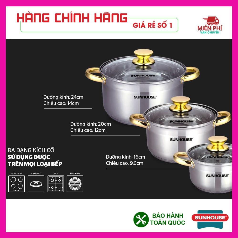 Nhà cửa & Đời sống > Dụng cụ nhà bếp > Nồi || Bộ nồi inox Sunhouse SH781, Bộ nồi Sunhouse SH781,, 5 đáy dùng cho bếp từ, 3 nồi kích thước: 16cm, 20cm, 24cm.Còn hàng
