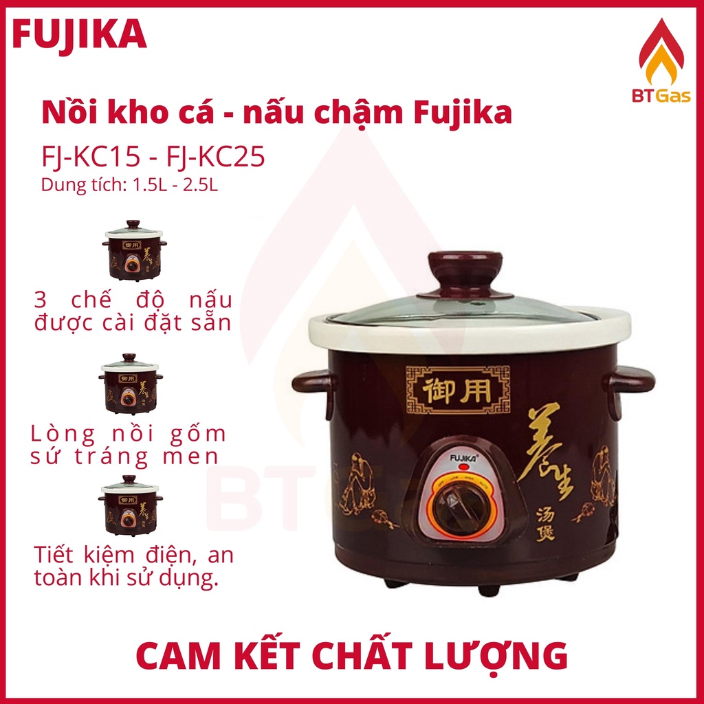 Nồi kho cá điện, nồi nấu cháo chậm đa Năng siêu tiện lợi dung tích 1.5L - 2.5L FUJIKA FJ-KC15 - FJ-KC25Dù bận rộn đến mấy, với nồi kho cá điện Fujika nhiều chế độ đun nấu và có tính năng chống trào tiện lợi, bạn cũng có thể nấu những món ăn truyền thống như cá kho, gà hầm, nấu chè… Ngày nay, với việc ra ngoài tiệm là có ngay suất cháo cho con bạn, rất tiện lợi và dễ dàng và rất nhiều người đều làm vậy. Nhưng với các Mẹ đang xem sản phẩm này thì ngược lại, luôn muốn tự tay mình nấu cho con một bữa ăn với đầy đủ chất dinh dưỡng theo ý mình và đảm bảo 100% vệ sinh.