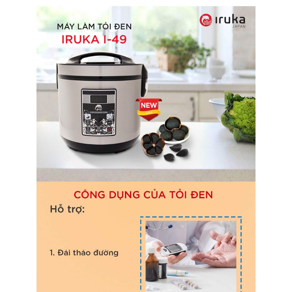 Tỏi đen đang là thực phẩm được nhiều người tin dùng, tỏi đen có chức năng hỗ trợ và chống các loại bệnh ung thư, mỡ trong máu, tim mạch, hỗ trợ hệ tiêu hóa... Để làm tỏi đen là điều không khó khăn với Máy làm tỏi đen chuyên dụng Iruka I-49, chỉ với vài thao tác đơn giản, bạn sẽ có ngay những củ tỏi đen chất lượng và an toàn. Máy làm tỏi đen chuyên dụng Iruka I-49 là sản phẩm mới trong các dòng sản phẩm máy làm tỏi đen gia đình tại Việt Nam với nhiều cải tiến vượt trội. Hãy cùng nhau khám phá về chiêc máy này nhé.Máy làm tỏi đen chuyên dụng Iruka I-49 được thiết kế hiện đại với màu sắc sang trọng, góp phần tô điểm không gian sử dụng. Sản phẩm với những ưu điểm vượt trội kết hợp thao tác sử dụng đơn giản, cơ chế lên men diễn hoàn toàn tự động đáp ứng nhu cầu của người dùng. Sản phẩm được cài đặt chu trình làm tỏi diễn ra trong vòng 8 - 12 ngày, sau khoảng thời gian đó bạn sẽ có được thành phẩm như mong đợi. Máy có dung tích 5 lít, có thể làm từ 1-2 kg tỏi đen, tỷ lệ lên men thành công cao đến 99%. Bên cạnh đó, công nghệ phát nhiệt ba chiều giúp quá trình lên men nhanh và đều hơn, lòng nồi thiết kế có khả năng giữ nhiệt và chống dính, có thể chọn chức năng làm tỏi 1 nhánh hoặc tỏi nhiều nhánh. Hơn nữa, chức năng sấy khô sẽ làm giảm lượng nước còn lại trong tỏi đen.