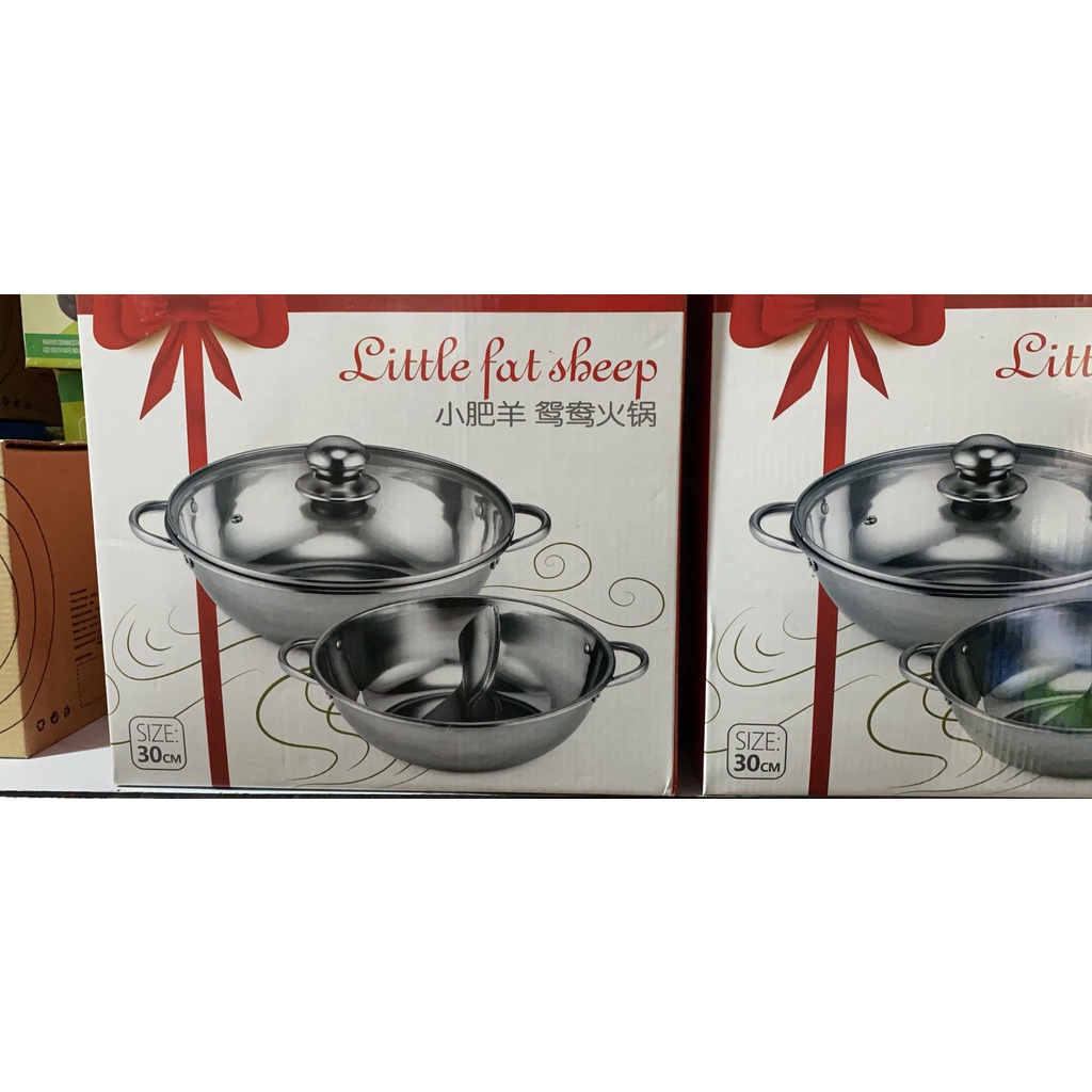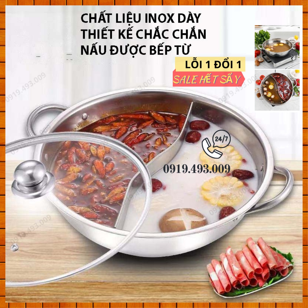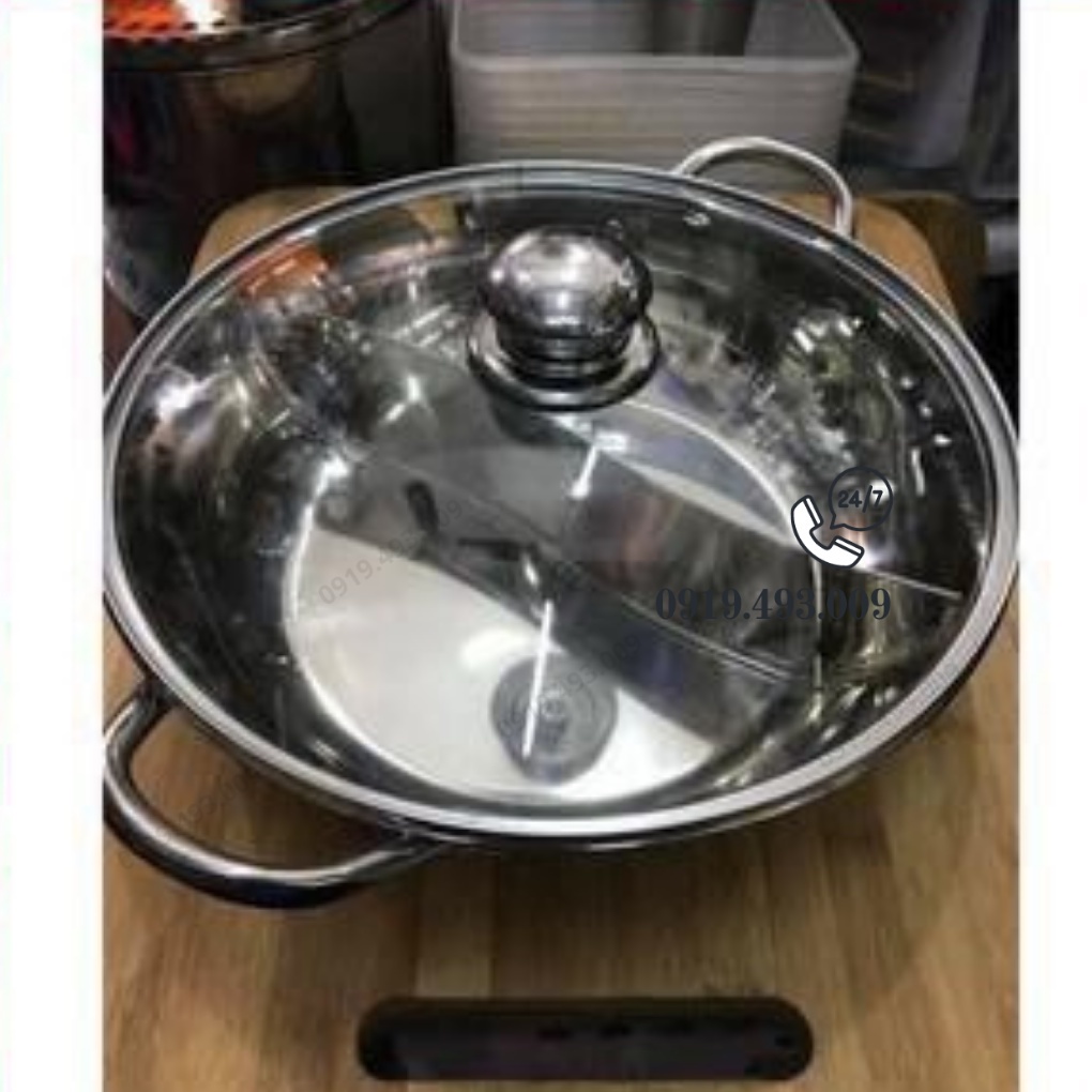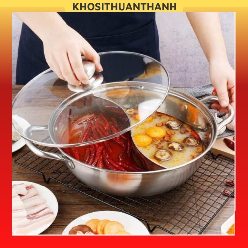 Nồi lẩu 2 ngăn 30cm nấu được bếp từ , lẩu chia ngăn, lẩu thái, chất liệu Inox có nắp kính (khosithuanthanh)