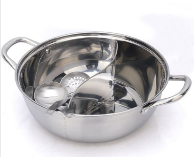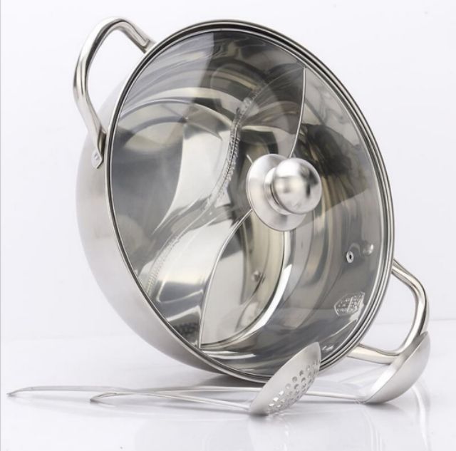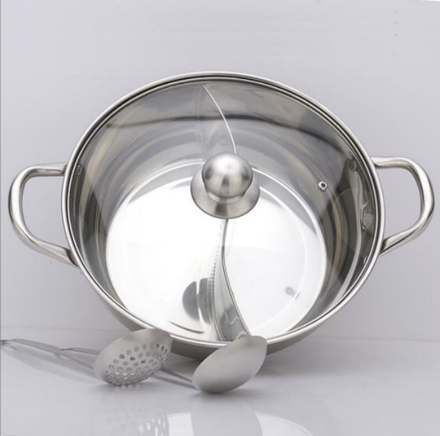 Nồi lẩu 2 ngăn inox 304 dày dặn 30cm.tăng bộ vá vớt lẩu 2 cái