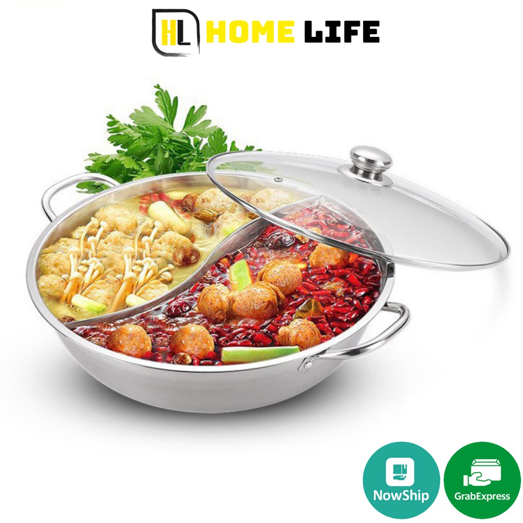 Nồi Lẩu 2 Ngăn Inox Size 30cm, 32cm Nấu Được Bếp Từ Có Nắp Kính Cực Tiện Dụng