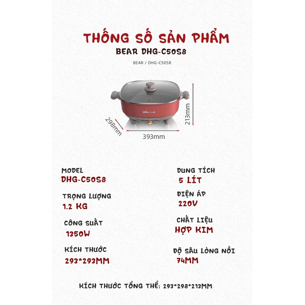 THÔNG TIN SẢN PHẨM*Tên sản phẩm: Nổi lẩu uyên ương Bear DHG-C50S8