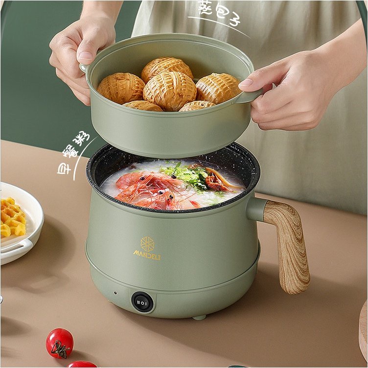 Nồi Lẩu Đa Năng Chống Dính Tay Cầm Gỗ, Ca Nấu Mì Đa Năng Dung Tích 1,8L - 2 Nấc Nhiệt Kèm Giá Hấp Tiện Dụng