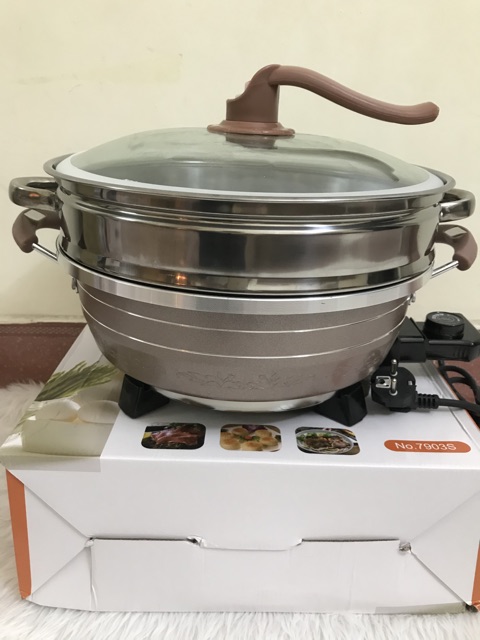 Bộ chảo đa năng đầy đủ: chảo chính, dây cắm, tặng kèm muôi gỗ, vỉ hấp trong lòng chảo + xửng hấp to bên trên