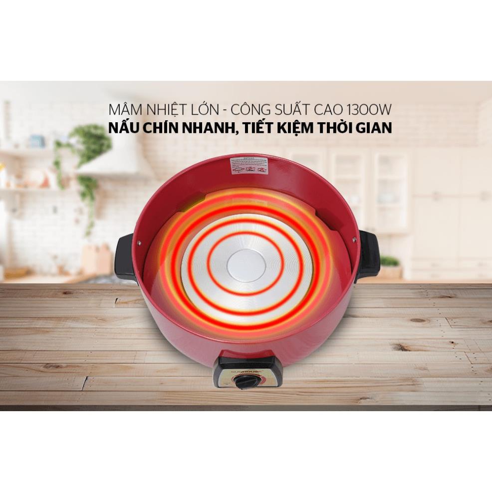 Lẩu điện có 1 mâm nhiệt lớn cùng công suất cao 1300 W giúp thức ăn chín nhanh, tiết kiệm thời gian
