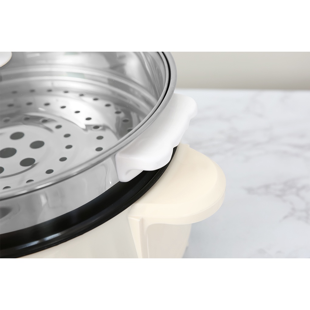 -Phần nồi lẩu điện và cả xửng hấp làm từ chất liệu nhựa an toàn, giúp bạn cầm nắm, di chuyển nồi thêm thuận tiện.
