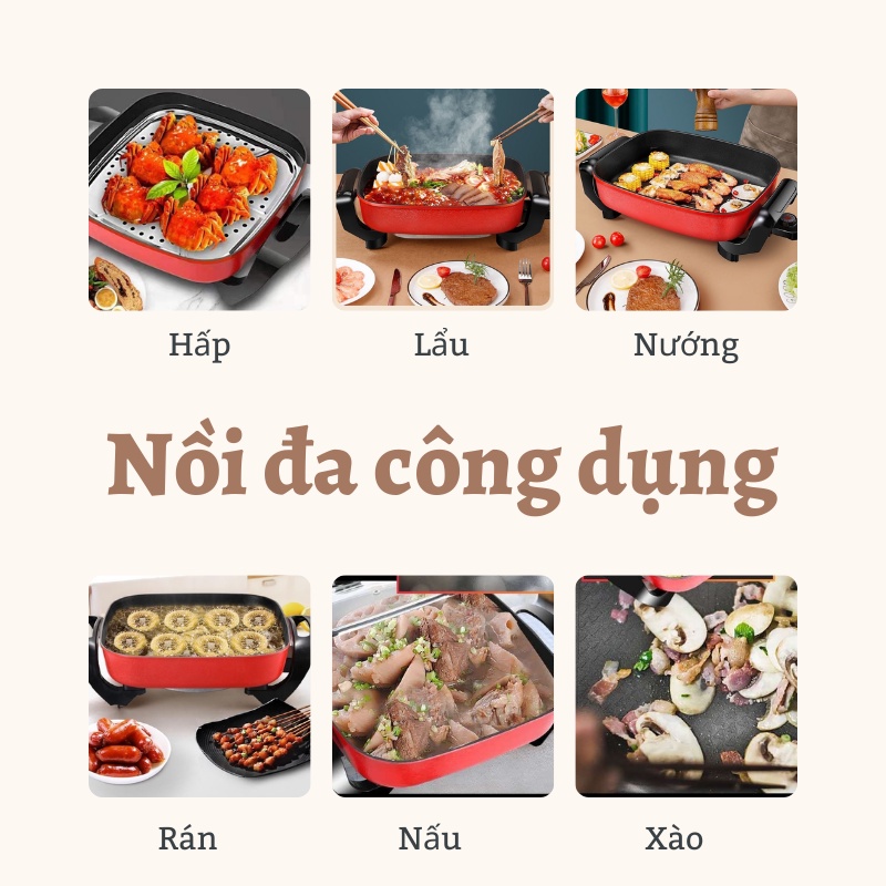 - Nồi lẩu điện - chảo điện đa năng có thể: hấp, chiên, rán, luộc, hầm, om, lẩu