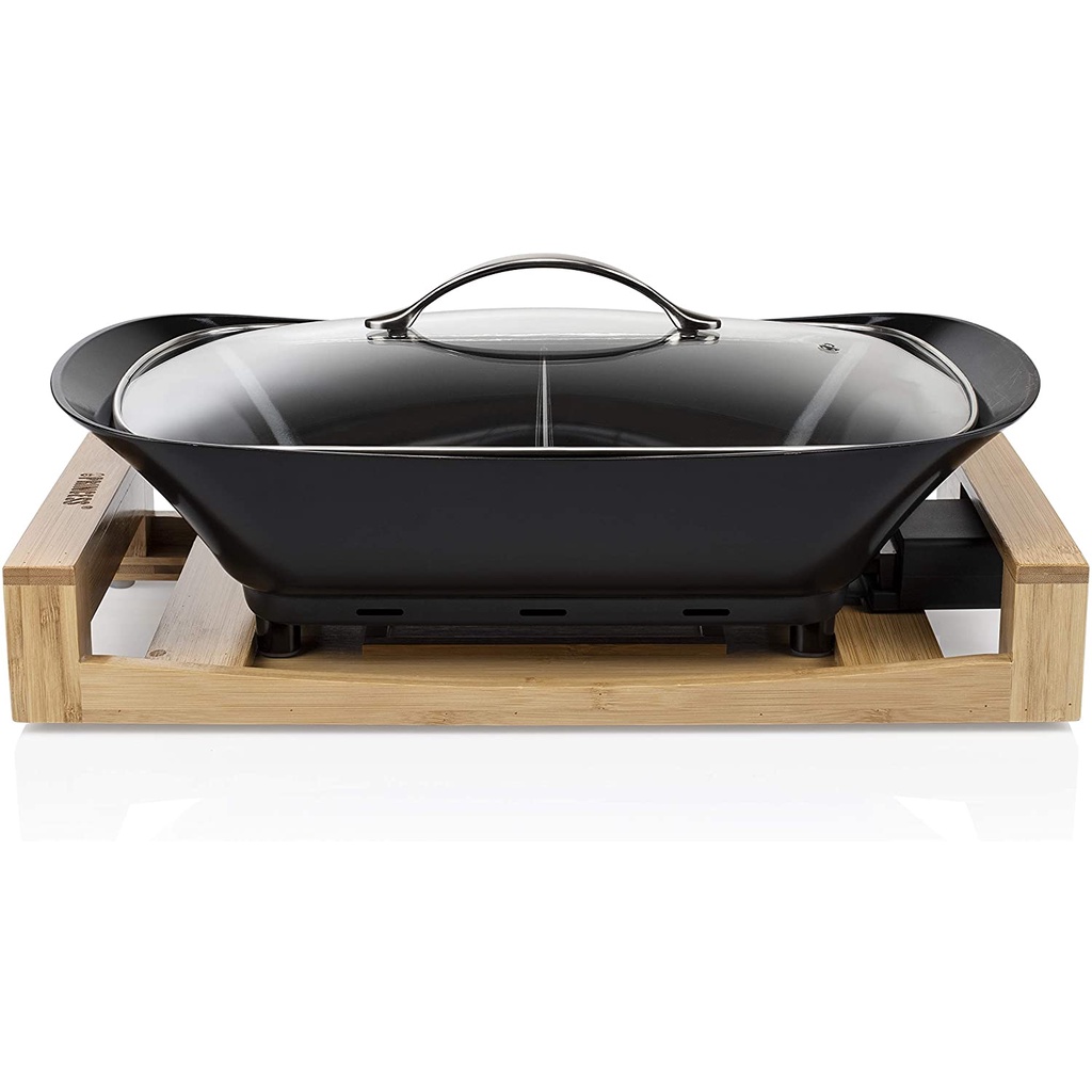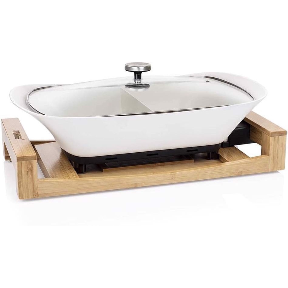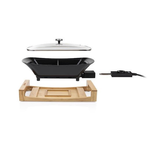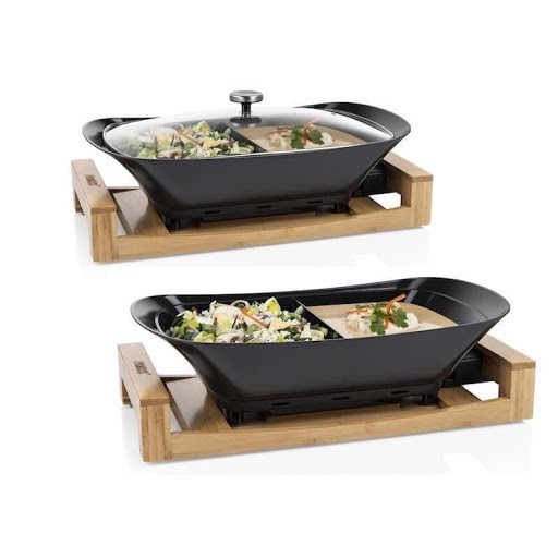 Nồi lẩu điện 2 ngăn Princess là một chiếc nồi nấu đa năng hiện đại và phong cách với đế bằng tre và được làm bằng chất liệu thép phủ lớp chống xước màu đen, có thể chuẩn bị đồng thời các món ăn khác nhau. Mang đến trải nghiệm ăn uống độc đáo và cho phép bạn chuẩn bị thức ăn tại bàn bằng cách sử dụng điều khiển nhiệt độ dễ dàng, ngoài ra nồi cũng có thể dùng để giữ ấm thức ăn.