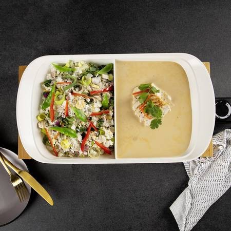 - Lớp phủ gốm chống xước màu đen đảm bảo nhiệt độ phân bổ đều, nhờ lớp phủ gốm sáng tạo, nồi nóng lên rất nhanh và giữ ấm trong thời gian dài. Bạn thậm chí không cần bất kỳ bơ hoặc dầu để nướng thức ăn của bạn. Vách ngăn phân chia độc đáo ở giữa nồi cho phép bạn nấu hai món ăn cùng một lúc hoặc sử dụng một mặt để phục vụ thịt, cá hoặc rau và mặt kia cho cơm, khoai tây hoặc bánh mì.
