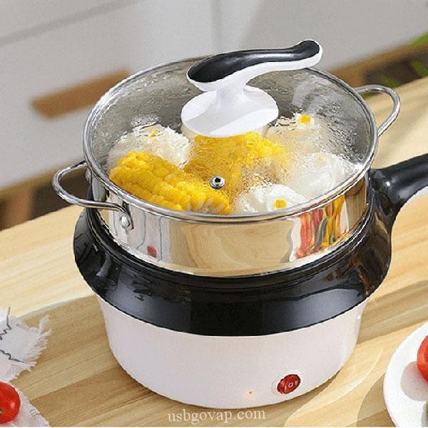 Nồi lẩu điện đa năng 2 tầng có lồng hấp và nắp kính cao cấp Ca điện mini nấu mì siêu tốc 18cm có quai cầm dài
