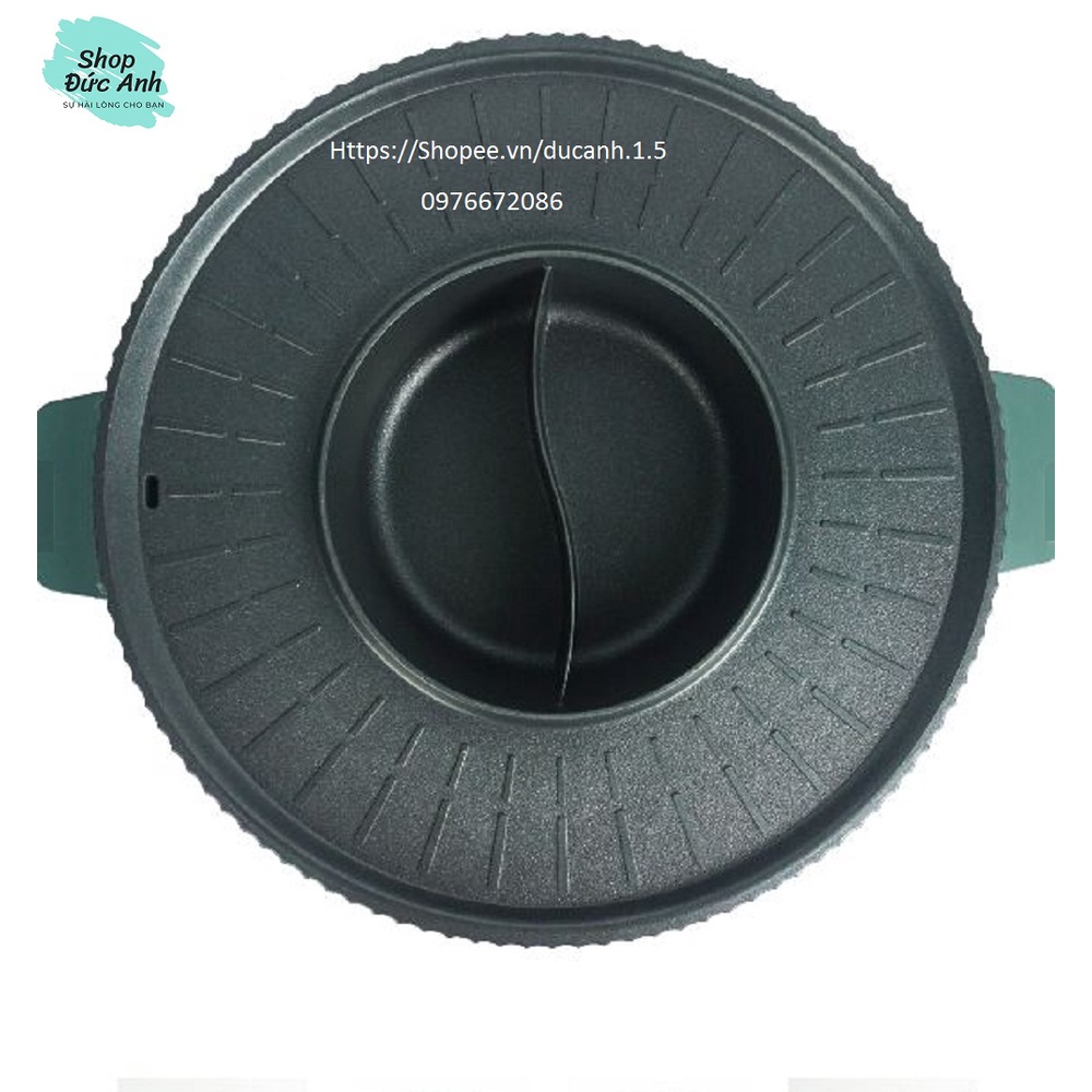 - Thiết kế kiểu mới, nồi ăn lẩu nằm gọn trong khay nướng, nồi có 2 ngăn giúp thưởng thức cả 2 món ăn cùng lúc