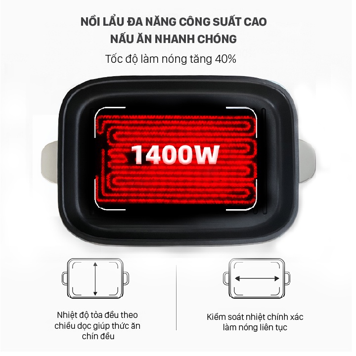 👉 Nồi có công xuất lên tới 1.400W, làm nóng rất nhanh, có thể điều chỉnh nhiệt độ tức thời cho phù hợp với nhu cầu sử dụng.