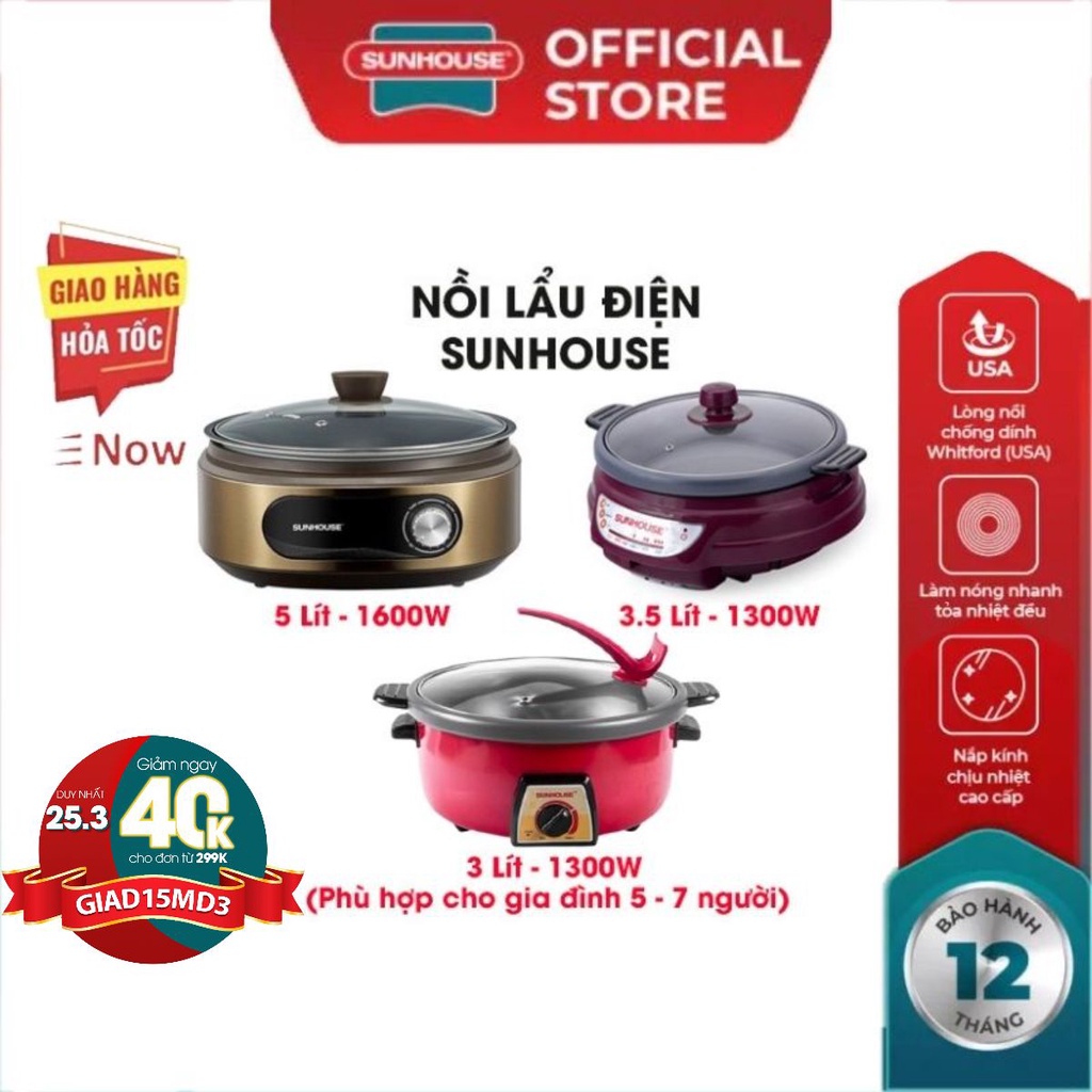 nồi lẩu điện sunhouse có 3 loại nồi: 3 lít, 3.5 lít và 5 lítnồi lẩu điện mini