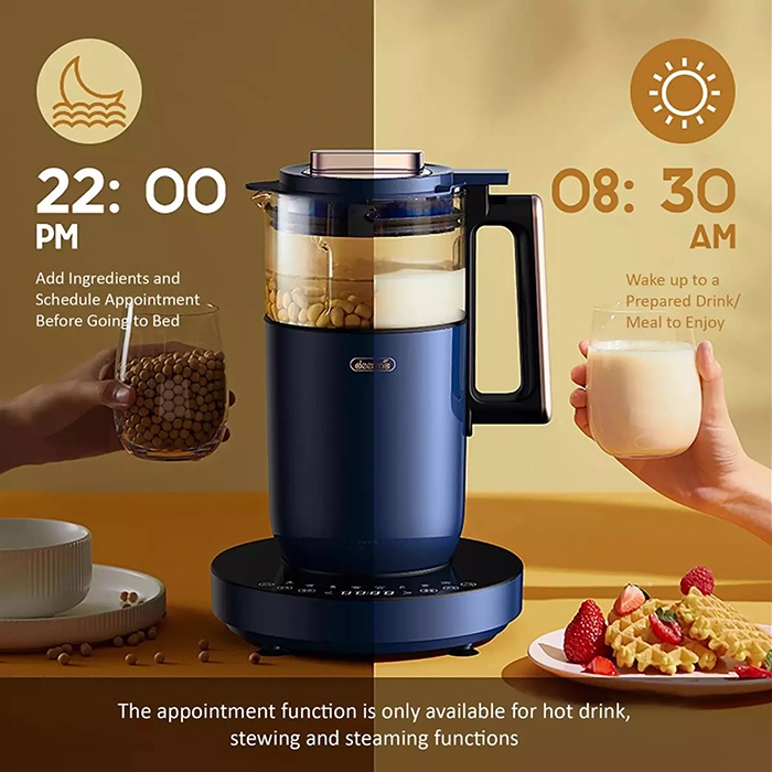 Đặc biệt, bộ máy làm sữa hạt Deerma DEM-NU600 còn được tích hợp chức năng hẹn 12 giờ vô cùng thông minh. Cụ thể người dùng có thể chuẩn bị và chế biến sẵn thực phẩm vào tối hôm trước và nghỉ ngơi, đến sáng hôm sau sẽ có món ăn đầy đủ dinh dưỡng mà không cần phải chờ đợi. Chức năng giữ nhiệt trong 6 giờ giúp bạn luôn luôn có món ăn ấm nóng cả ngày dài.