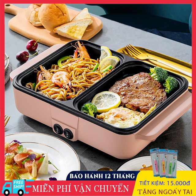 Nồi lẩu điện mini 2 ngăn đa năng lẩu, nướng riêng biệt, nồi nướng điện siêu tốc chống dính thế hệ mới, tiện dụng