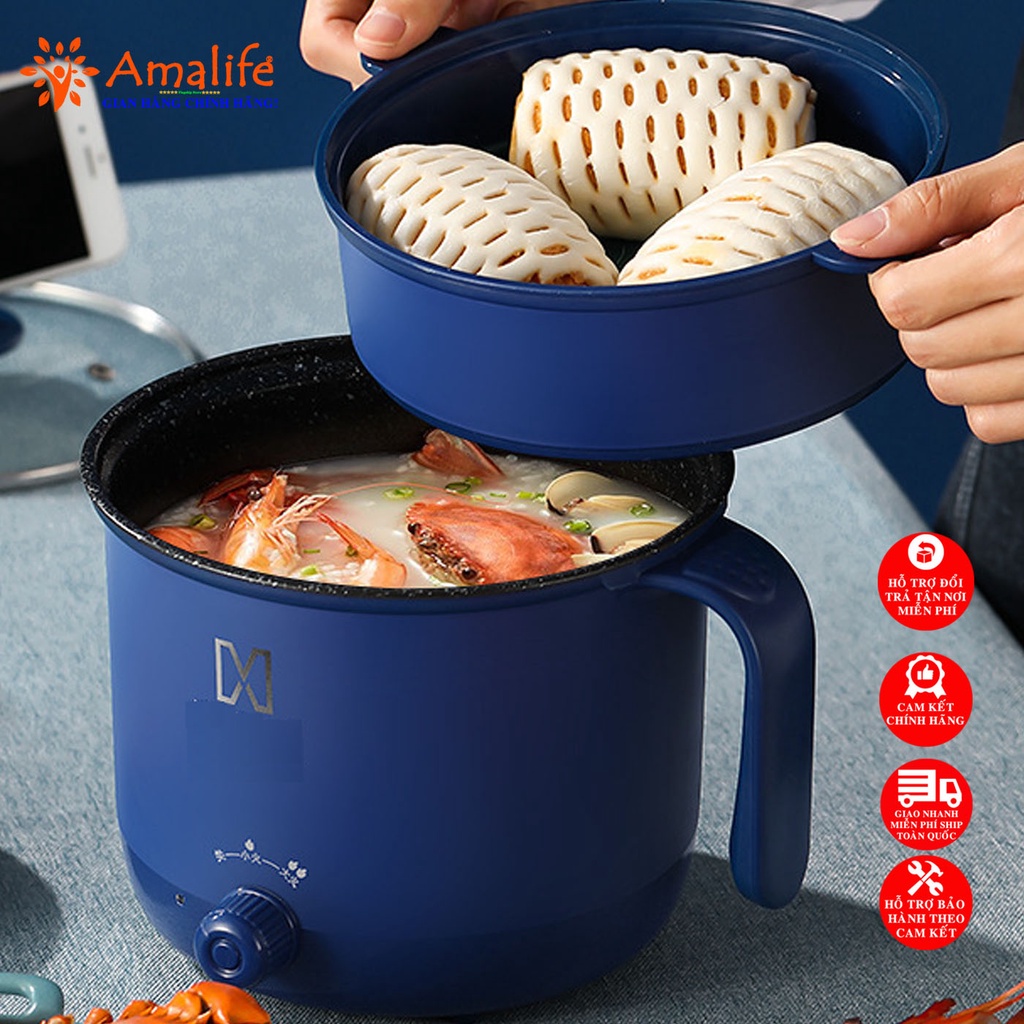 Nồi Lẩu Điện Mini Ca Nấu Mì 2 Tầng Kèm Giá Hấp Đa Năng Nướng, Luộc, Chiên Chống Dính Vấn Đá Tiện Lợi Chính Hãng Amalife