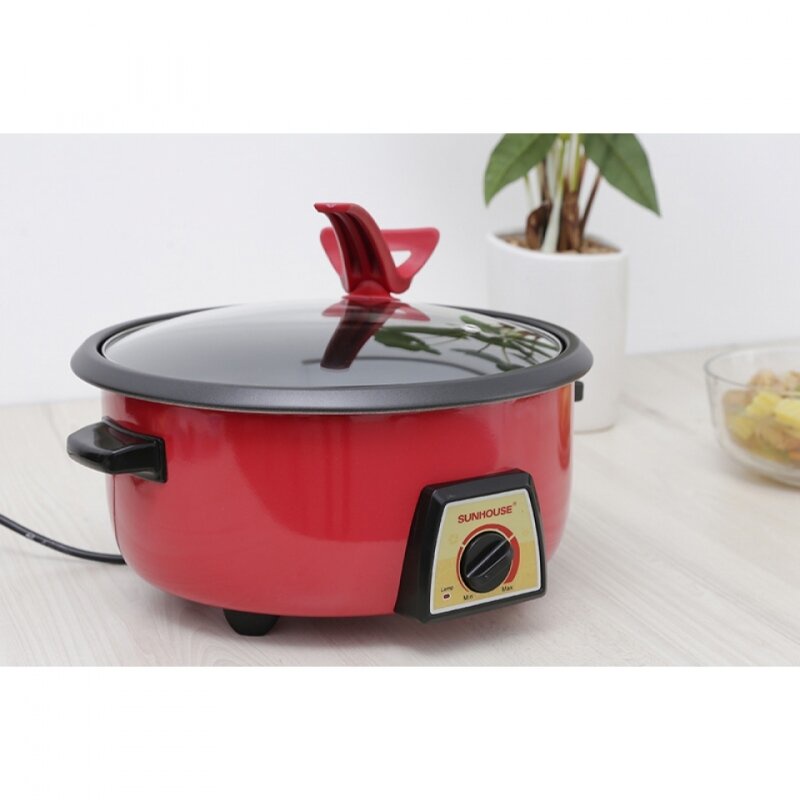 - Tay cầm của nồi lẩu điện Sunhouse được bọc nhựa cách nhiệt, dễ dàng cầm nắm và di chuyển nồi