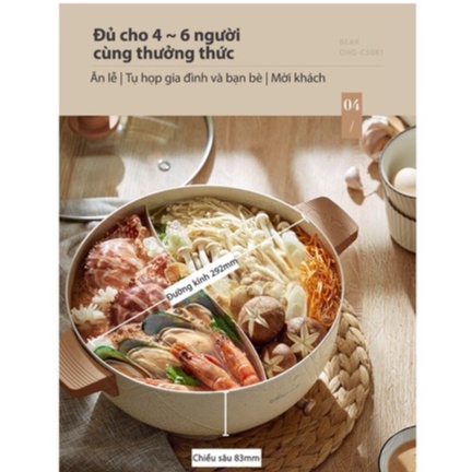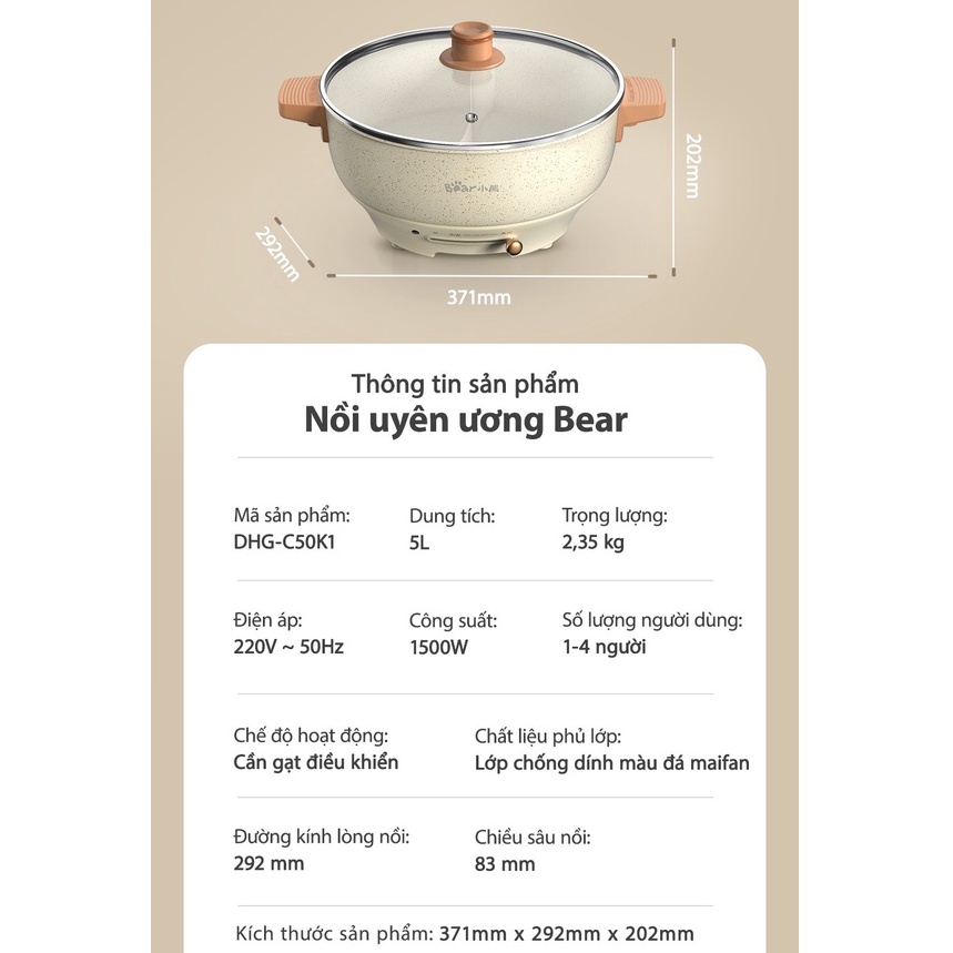 Với kích thước dài, rộng và cao lần lượt là 371 x 292 x 202 mm, chiếc nồi uyên ương Bear C50K1 sở hữu dung tích lên đến 5 lít, đủ dùng cho cả gia đình 4 người.