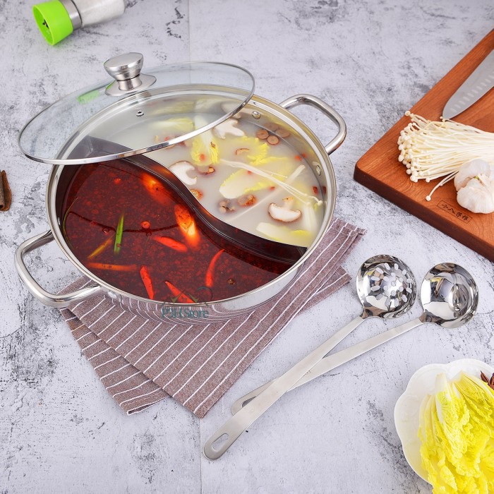 Nồi lẩu inox 2 ngăn tiện dụng, với nắp đậy bằng kính cao cấp có thể nấu 2 loại lẩu 1 lúc