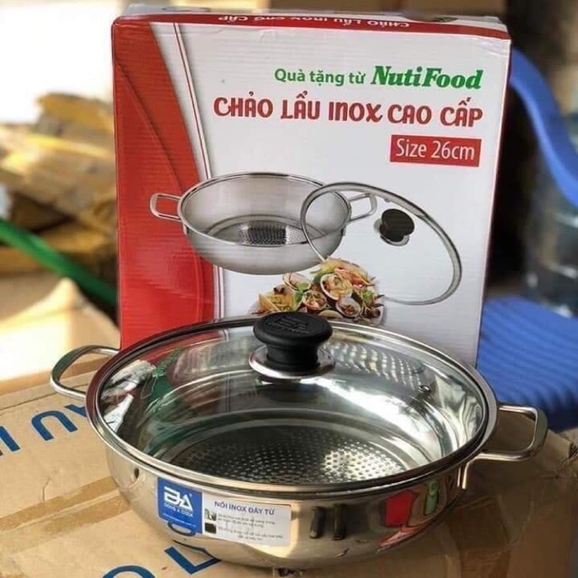 Nồi lẩu chống cháy inox 100% hàng KM của NuTiFood cực đẹp cực rẻSize 26 vung kính là hàng KM lên ko có nhiều