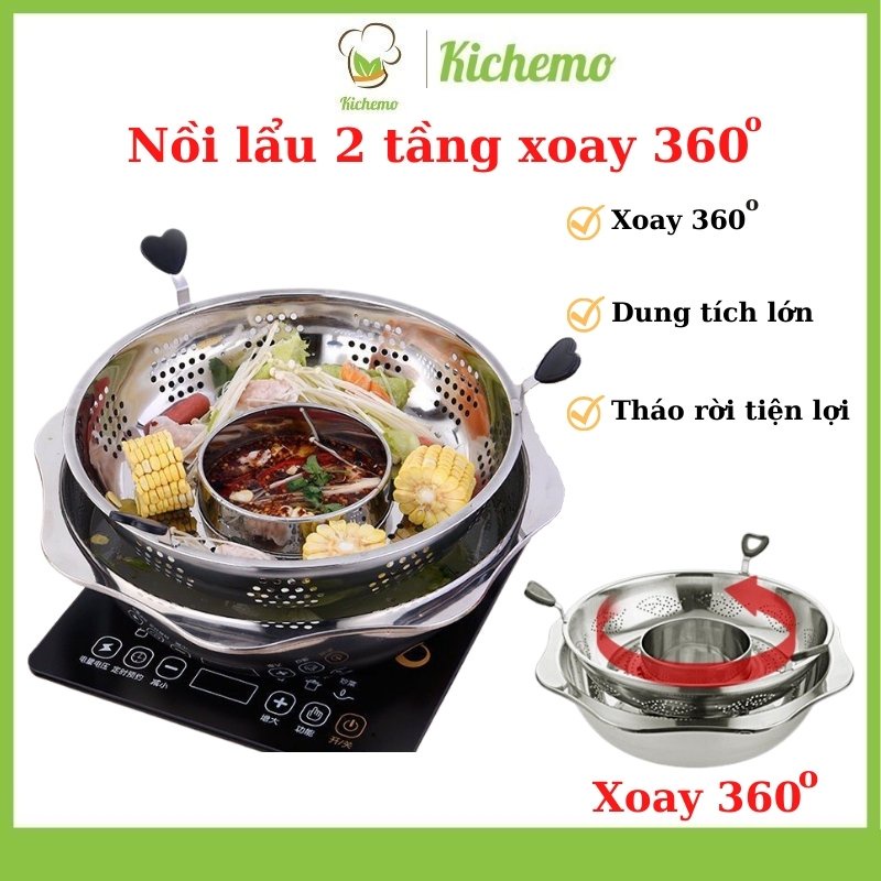 Nồi lẩu inox xoay 2 tầng Hàn Quốc Nồi lẩu inox 2 tầng dùng được cả bếp từ và bếp gas