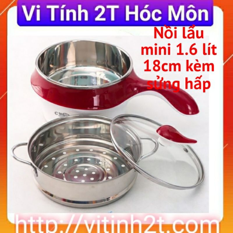 NỒI LẨU MINI 1,6 LÍT 18CMNếu những loại nồi lẩu to không thích hợp sử dụng khi có 1-2 người, khó mang theo khi đi du lịch, dã ngoại và giá cả cao làm bạn băn khoăn. Vậy thì hãy chọn nồi lẩu mini siêu tốc 2 trong 1 tiện dụng giới thiệu hôm nay, chắc chắn sẽ khiến bạn hài lòng. - Có thể dùng để nấu cơm, chế biến các món canh, xào, lẩu, chiên, kho... - Kèm 1 xửng hấp, thuận tiện để chế biến món hấp hoặc hâm lại thức ăn khi cần. Chất liệu thép không gỉ bền đẹp, chống dính, an toàn cho sức khỏe. - Vung kính chịu nhiệt, dễ quan sát thức ăn khi nấu nướng. Có chức năng hẹn giờ, thuận tiện hơn khi sử dụng. - Công suất 500W, tiết kiệm điện năng. - Kiểu dáng gọn nhẹ, dễ dàng đặt trên bàn ăn, không chiếm nhiều diện tích. Nồi lẩu mini rất thích hợp cho 1- 2 người ăn hoặc mang theo khi đi du lịch. Tiện dụng hơn nữa khi bạn nấu đồ ăn nhanh ở cơ quan... - Sản phẩm hiện đại, tiện dụng, an toàn, giúp bạn có thêm thời gian dành cho gia đình và bản thân. Kiểu dáng hiện đại và sang trọng, dễ sử dụng và dễ dàng tháo lắp khi lau chùi. Vỏ làm từ nhựa, ruột ấm làm từ inox tăng tốc độ đun, giúp bề mặt sáng đẹp, tăng độ bền, chống bám cặn, dễ dàng vệ sinh, Sản phẩm còn là một vật trang trí xinh xắn cho không gian bếp của bạn, đây sẽ là một nét chấm phá cho không gian bếp, sẽ sang trọng hơn và bắt mắt hơn rất nhiều