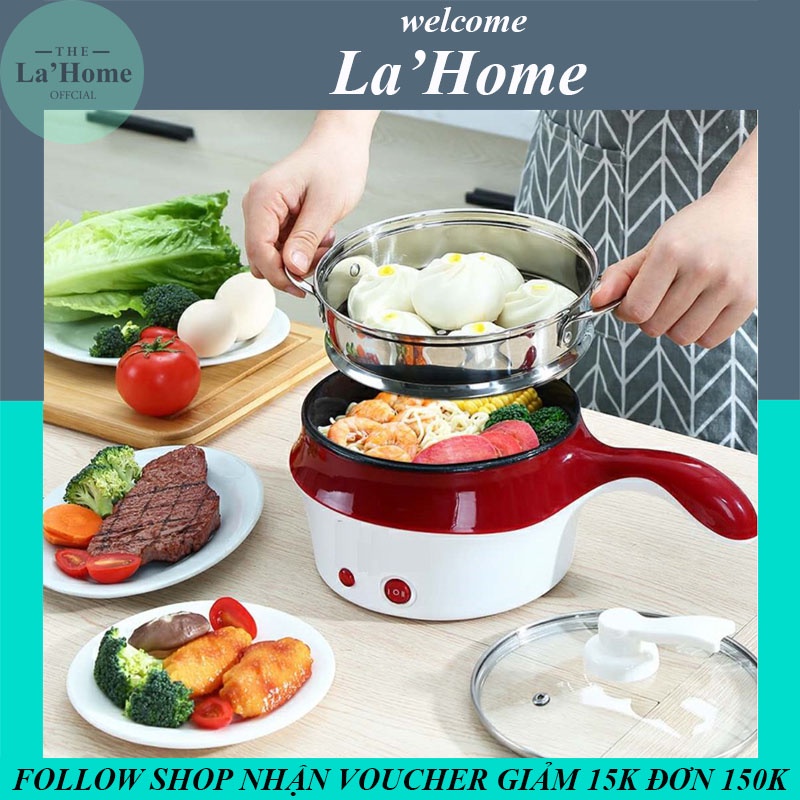Nồi lẩu mini 2 tầng La'Home kèm giá hấp, nồi nấu mì nồi hấp mini nồi điện mini đa năng 2 tầng chính hãng