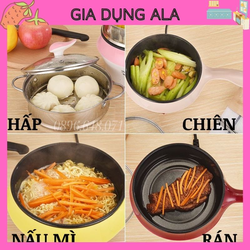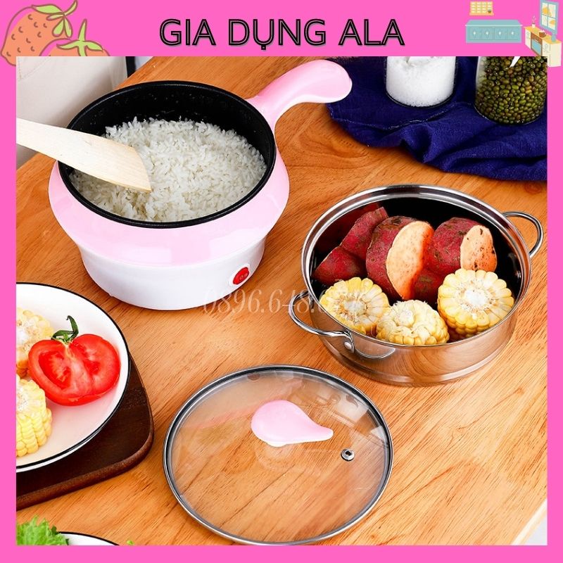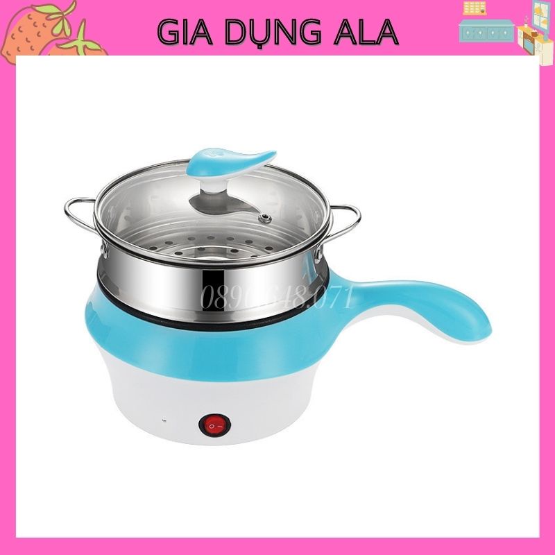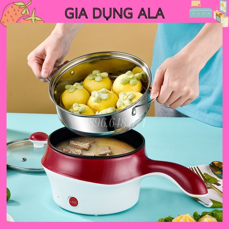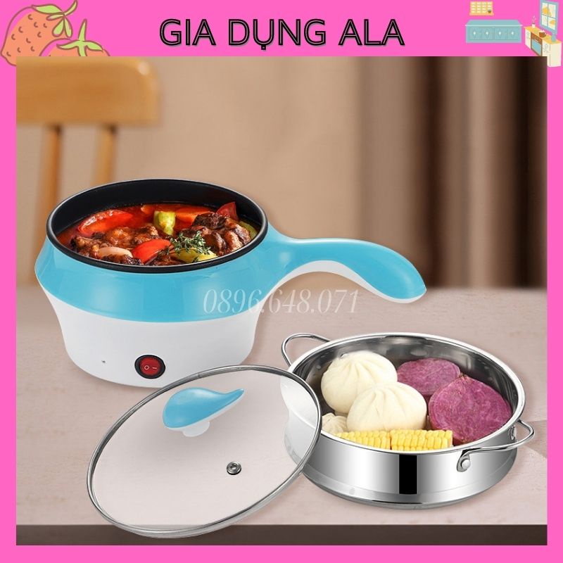 Nồi Lẩu Mini Điện Đa Năng Nấu Mì 2 Tầng Chống Dính Siêu Tốc Hấp Rán Chiên 18cm, Ca Nấu Mì Mini Kèm Xửng