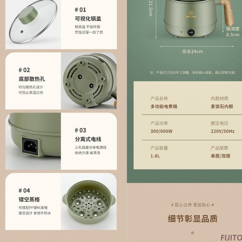 👍- Công suất: 50Hz/600W. Kích thước: Đường kính lòng nồi 18cm x chiều cao 10cm, có thể chứa dung tích 1.8 lit