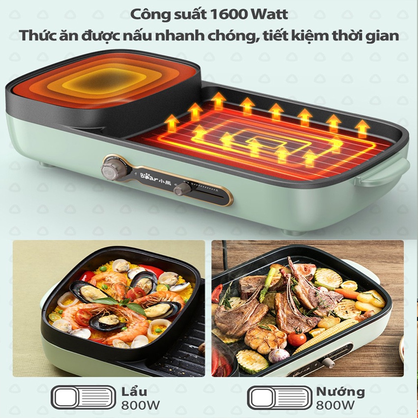 Nồi lẩu nướng 2 ngăn Bear DKL-C15G1, dung tích 3L (2 ngăn lẩu và nướng) công suất 1600W (Hàng chính hãng 1 đổi 1 trong 30 ngày, bảo hành 18 tháng)THÔNG TIN SẢN PHẨM