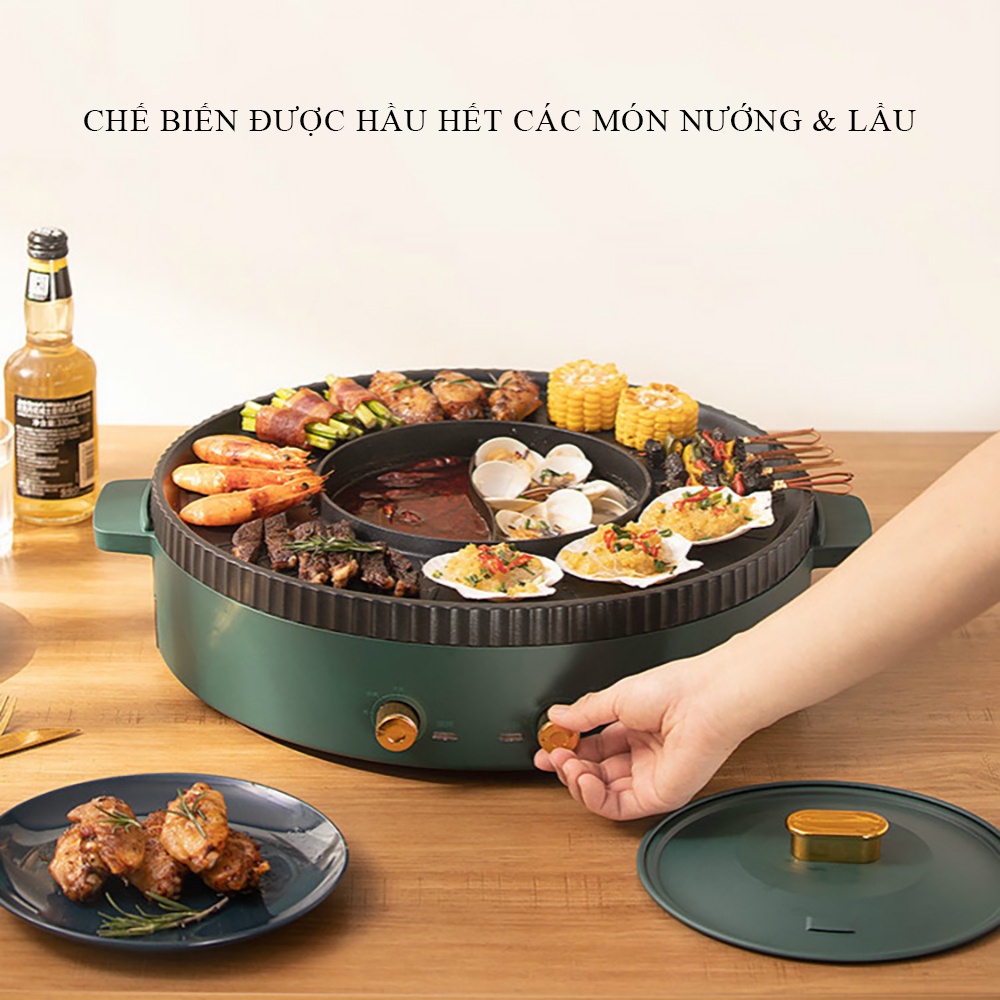Nồi lẩu nướng 2 ngăn đa năng chống dính công nghệ Nhật, bếp nướng điện 2 trong 1 - Bảo hành 2 năm